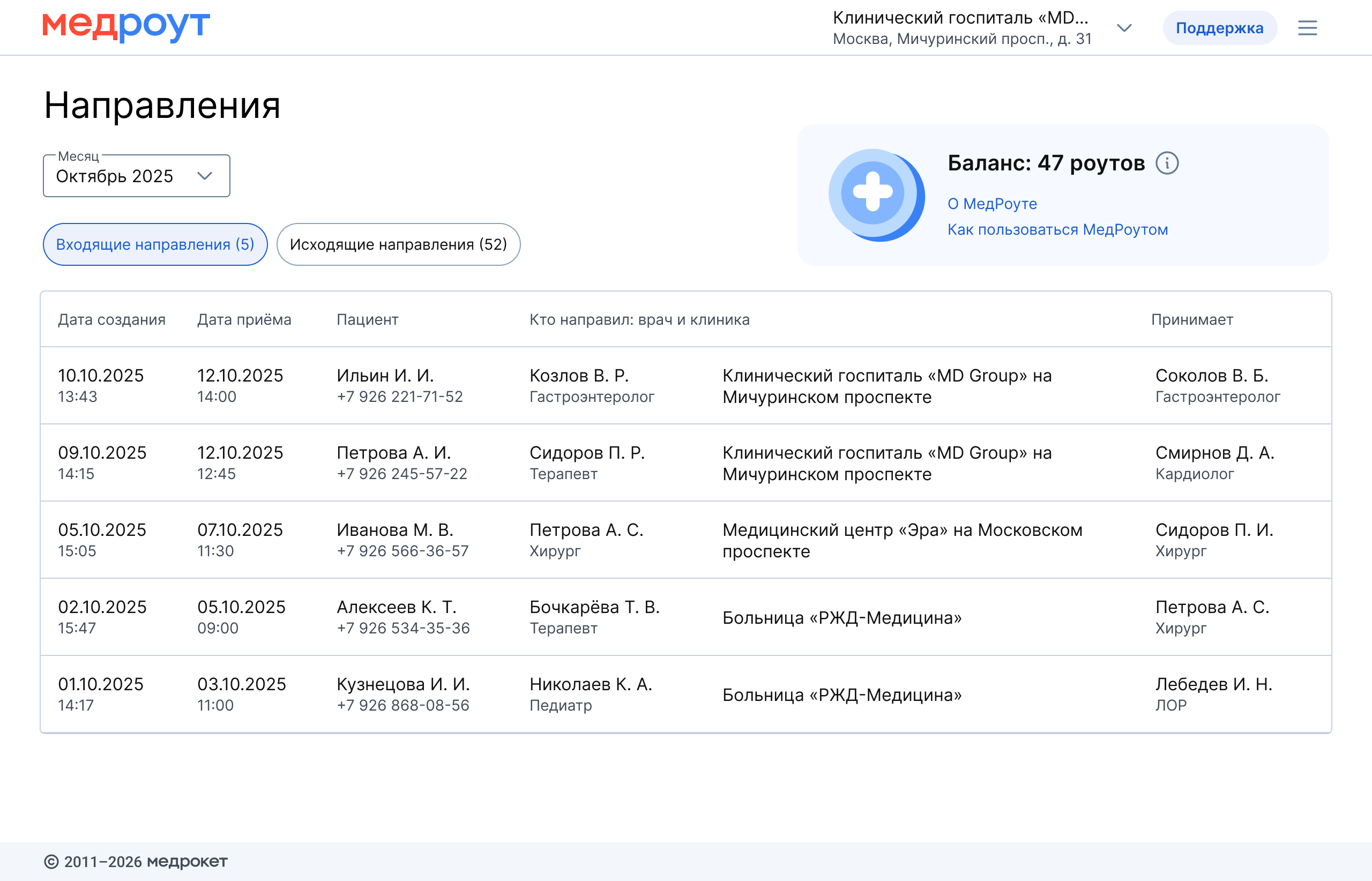 В МедРоуте направления не создаются. Кабинет используется только для просмотра и контроля направлений.