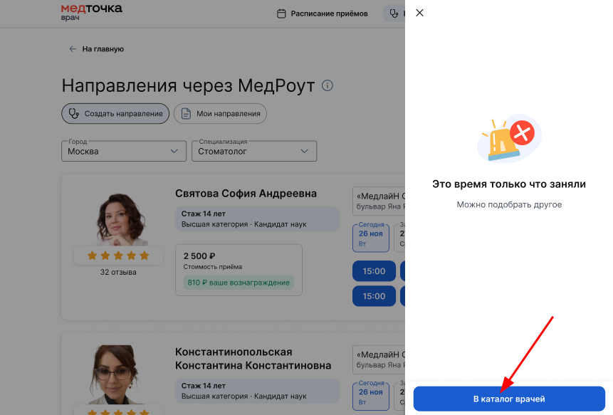Что делать: Перейдите в каталог врачей и создайте направление на свободное время.