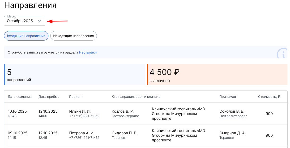 Над таблицей выводится общее количество входящих направлений за месяц и сумма, которую ваша клиника за них заплатила.