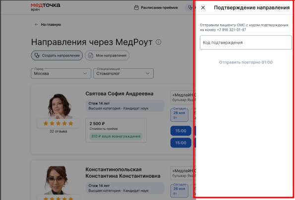 После ввода кода направление подтверждается, а запись пациента фиксируется в системе.